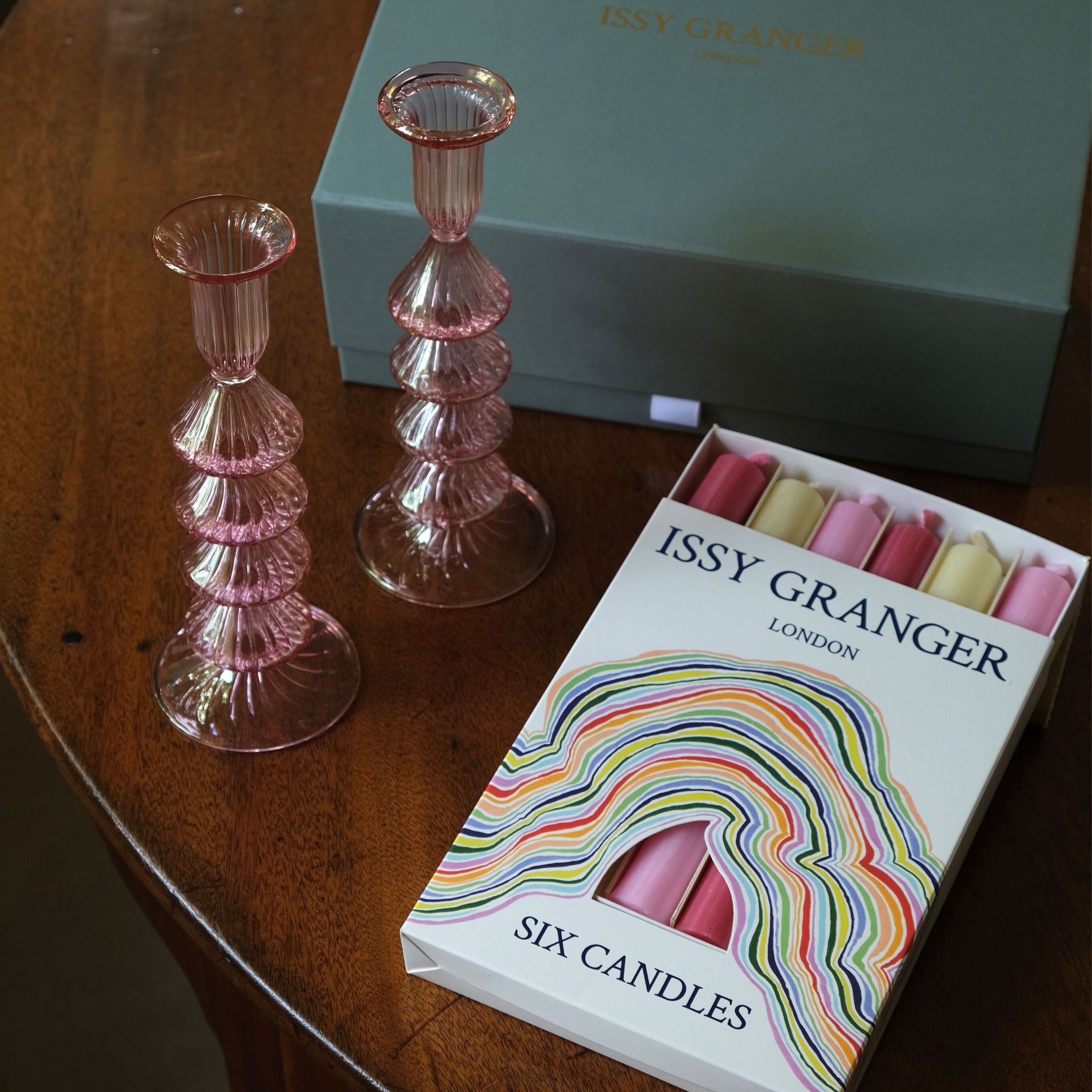 The Buto Candlelight Set includes a pair of our beautiful handblown Buto Candlesticks and a box of six Dinner Candles. Available in either Pink or Green, this set is an ideal choice for your interior-loving friends.